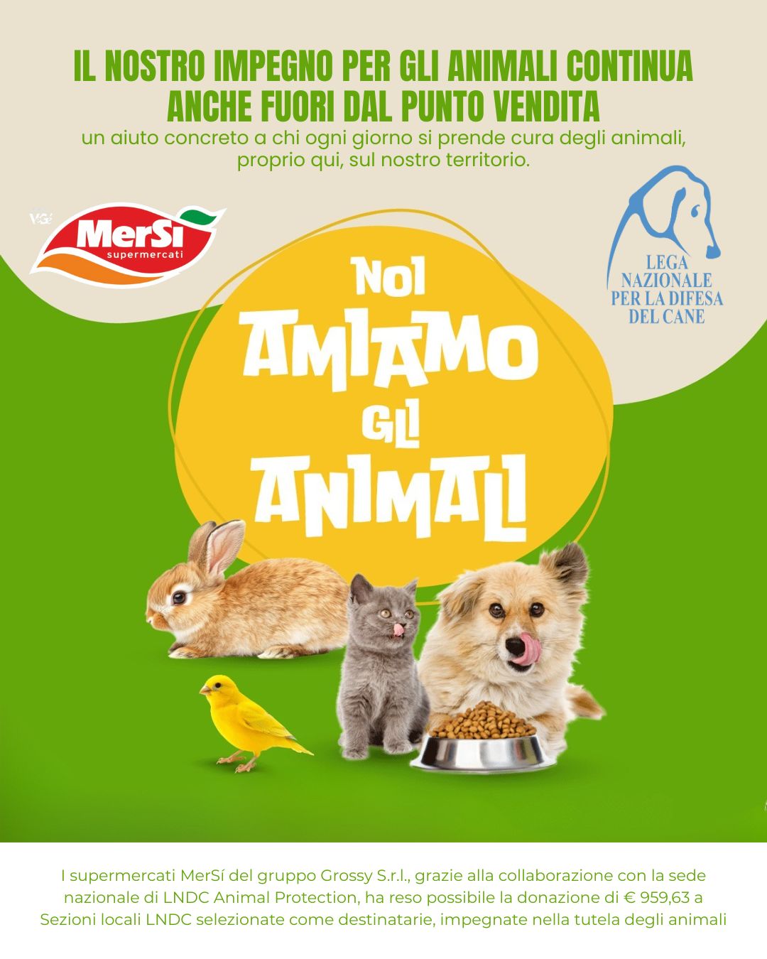 Siamo orgogliosi di annunciare che i Supermercati MerSΓ, del gruppo Grossy S.r.l., hanno donato β¬ 959,63 a favore delle Sezioni locali di LNDC Animal Protection. Questo contributo rappresenta un aiuto concreto a chi, ogni giorno, si dedica con passione alla cura e alla tutela degli animali sul nostro territorio.
